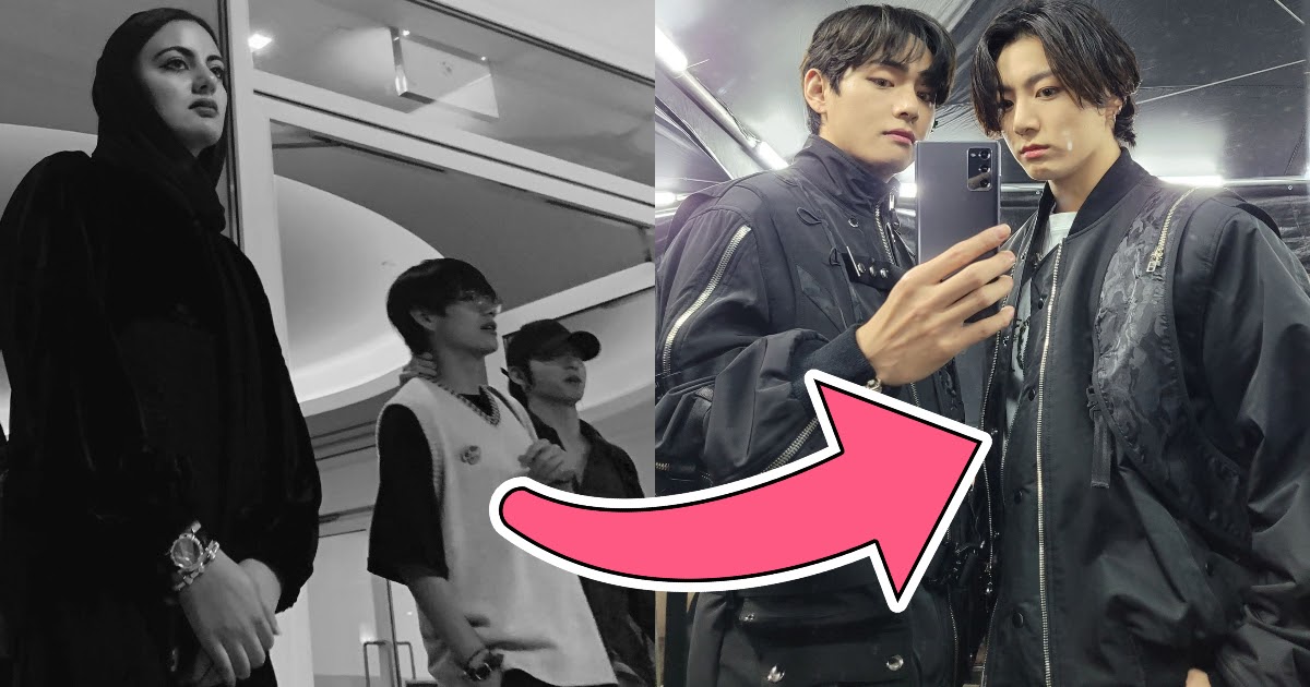 Lorsque BTS est rentré en Corée du Sud après un concert réussi à Riyadh, en Arabie Saoudite, pour sa série d’émissions de radio. AIMEZ VOUS : PARLEZ VOUS tour, une femme posait pour une photo, et V et Jungkook étaient en arrière-plan !
