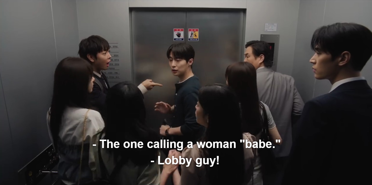 And because this show knows how to make timing part of the comedy, their first company meeting is when an earlier misunderstanding decides to make a comeback. The side effect of Tae Hyung being at the office is that Hyun Jin’s coworkers quickly recognize that he is the “lobby guy” from the viral office clip when he surprised Hyun Jin at work with Woo Joo.