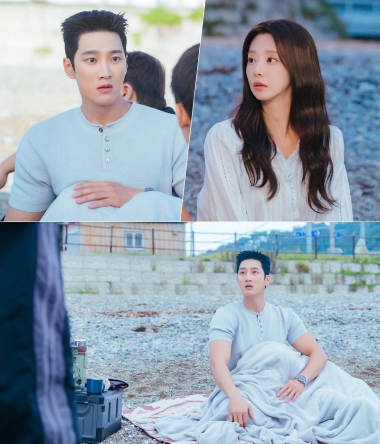 In newly released stills from the drama’s next episode, Seon Jae Gyu and Yoon Bom attempt to go on a secret date after finally beginning a relationship. Although the couple tries to furtively spend time together while avoiding the gazes of others, their bliss is short-lived: while enjoying a date at the beach, things take an unexpected turn when they suddenly find themselves surrounded by people.
