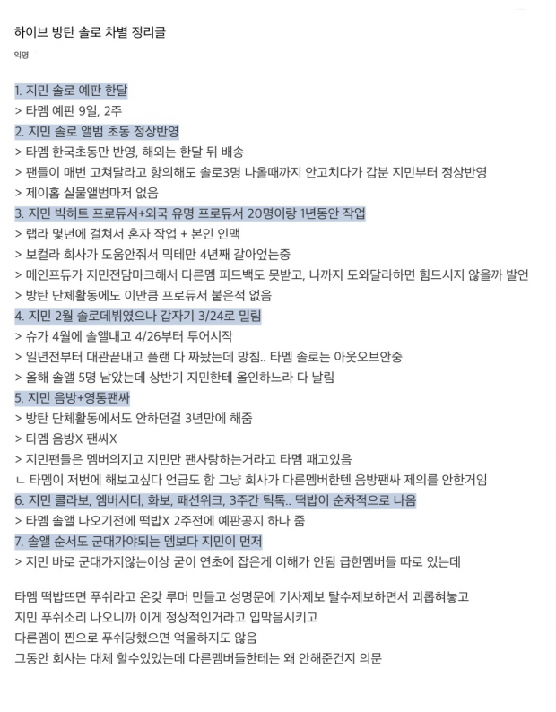 The user listed multiple key points to bring out HYBE’s “discrimination,” which specified an unfair promotional dissemination. Overall, the list elaborated how Jimin’s schedule was more consistent than BTS members’ previous promotions, including their group, and solo activities.