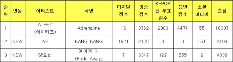 IVE‘s “BANG BANG” came in second place with a score of 4,198, while HIGHLIGHT’s Yang Yoseob‘s “Fade Away” ranked third with a score of 4,038.
