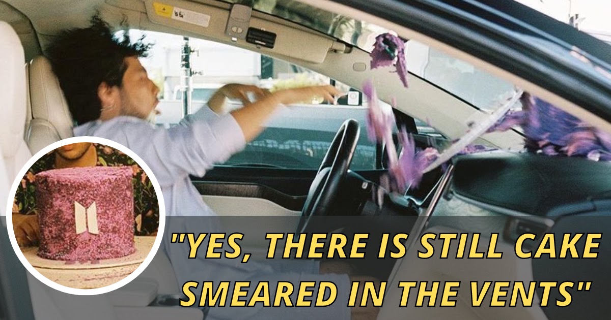 Le gâteau finit par s’écraser contre le pare-brise dans la vidéo, laissant un désordre partout sur le tableau de bord de la voiture.