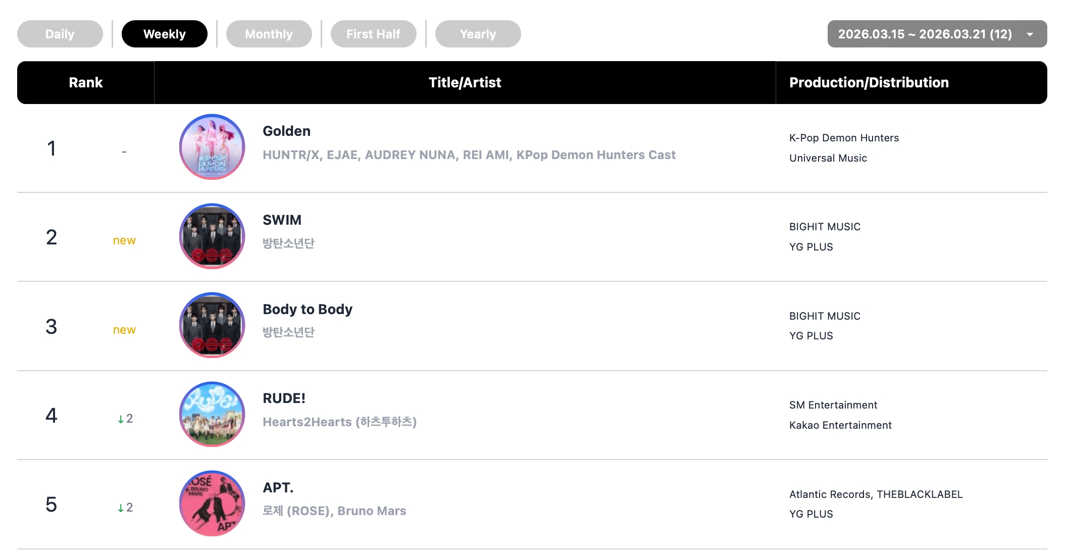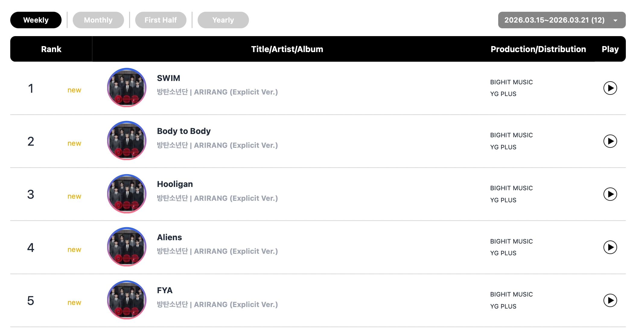 BTS also swept all of the top five spots on this week’s digital download chart with songs from “ARIRANG.” Their title track “SWIM” debuted at No. 1, followed by “Body to Body” at No. 2, “Hooligan” at No. 3, “Aliens” at No. 4, and “FYA” at No. 5.