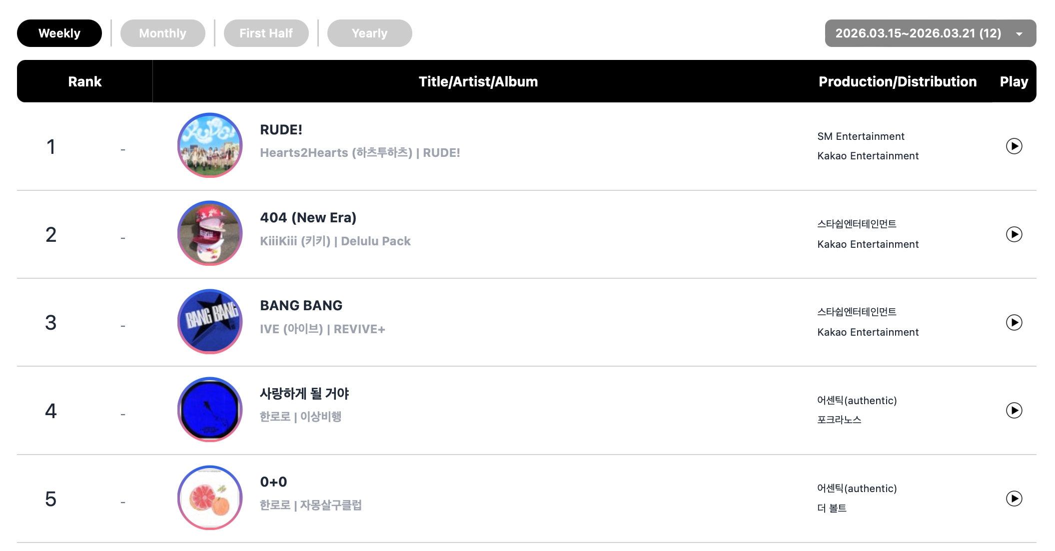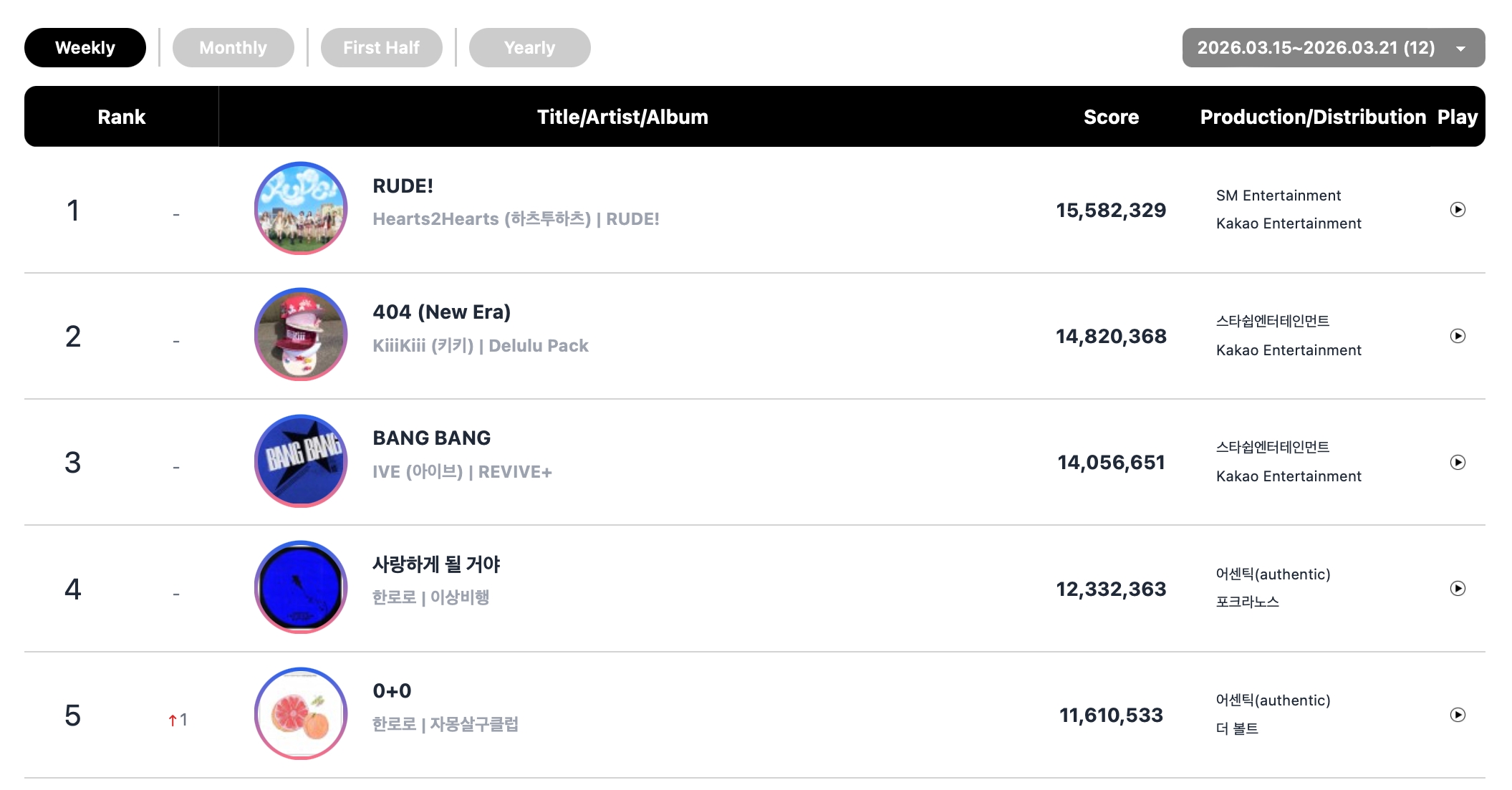 Hearts2Hearts maintained their double crown on the Circle charts this week, with their hit single “RUDE!”remaining No. 1 on both the overall digital chart and the streaming chart for the second week in a row.The top five songs on this week’s overall digital chart and streaming chart were exactly the same: “RUDE!” came in at No. 1 on both charts, trailed by KiiiKiii’s “404 (New Era)” at No. 2, IVE’s “BANG BANG” at No. 3, HANRORO’s “Landing in Love” at No. 4, and HANRORO’s “0+0” at No. 5.