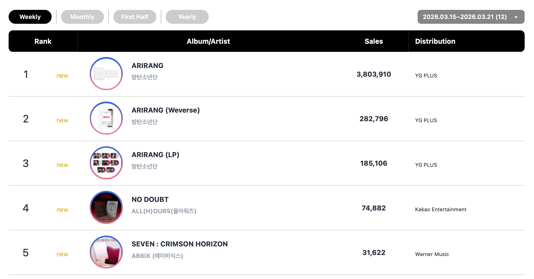 All of the top three spots on this week’s physical album chart went to BTS’s new album “ARIRANG”: the regular version of the album debuted at No. 1, while the Weverse and LP versions charted separately at No. 2 and No. 3.