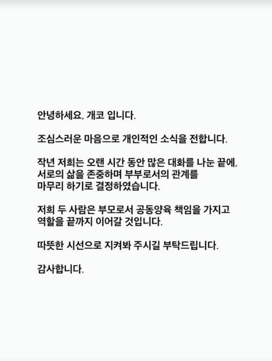 “Last year, after many conversations over a long time, we decided to end our relationship as a married couple while respecting each other’s lives,” Gaeko wrote.