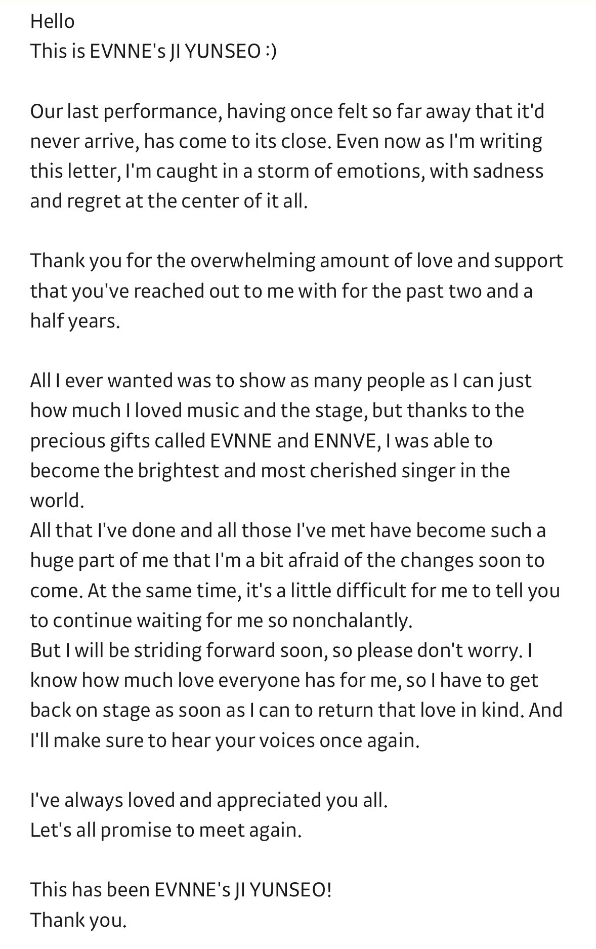 EVNNE’s Ji Yunseo has shared a heartfelt letter to his fans following his final performance as a member of the group.