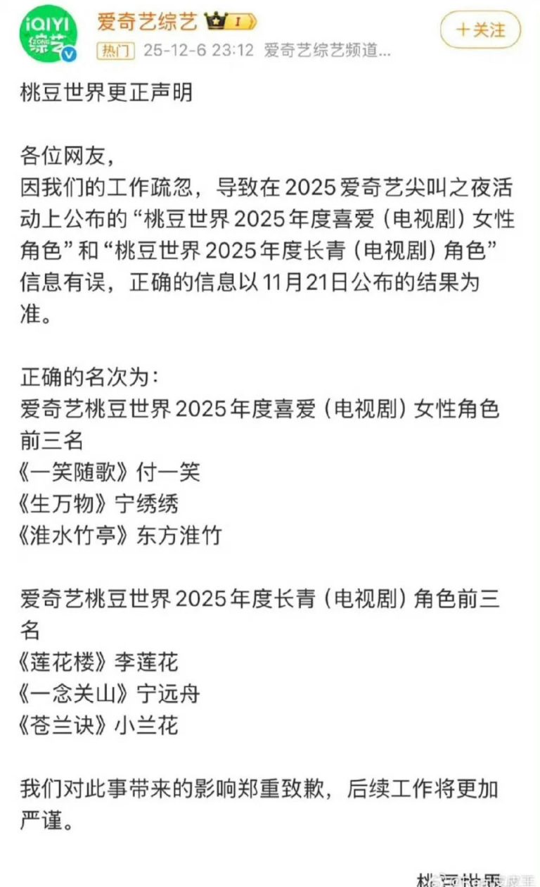 Later, iQIYI issued an official apology, acknowledging that the winner announcement at the event was incorrect. They emphasized that the correct winners should be based on the announcement from November 21.
