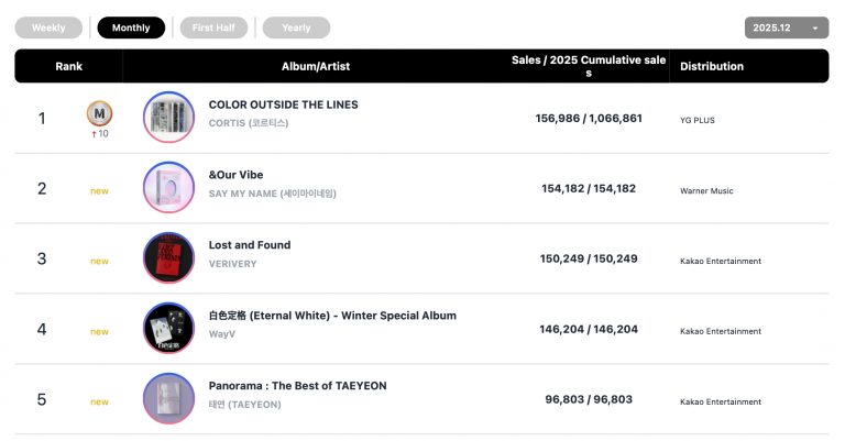 CORTIS topped the physical album chart for December with their debut EP “COLOR OUTSIDE THE LINES.”
