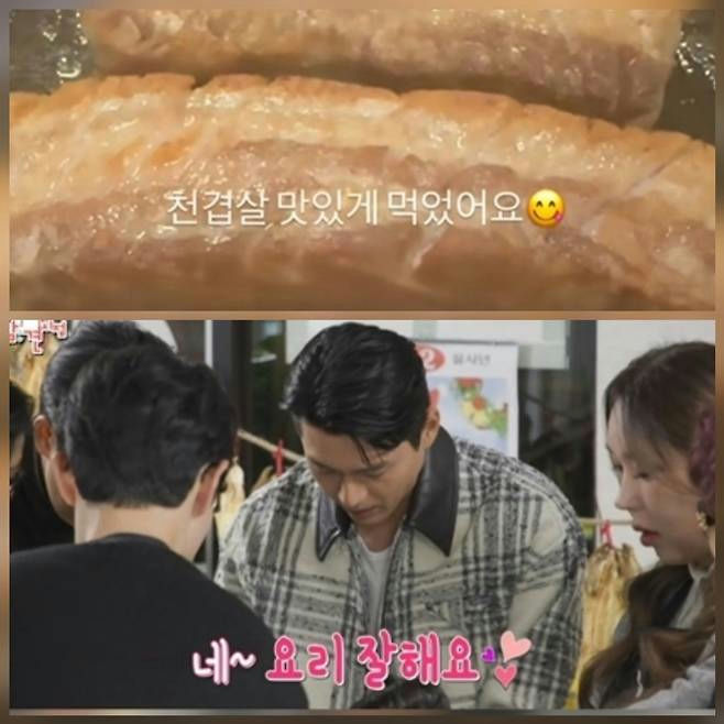 The pork neck was first introduced on MBC’s variety show Omniscient Interfering View on December 27. During filming on a snowy day, Hyun Bin received the meat as a gift from Lee Young Ja. Watching it grill alongside dried greens, whole garlic, and fresh kimchi, he praised its rich flavor, noting how savory the fat tasted.