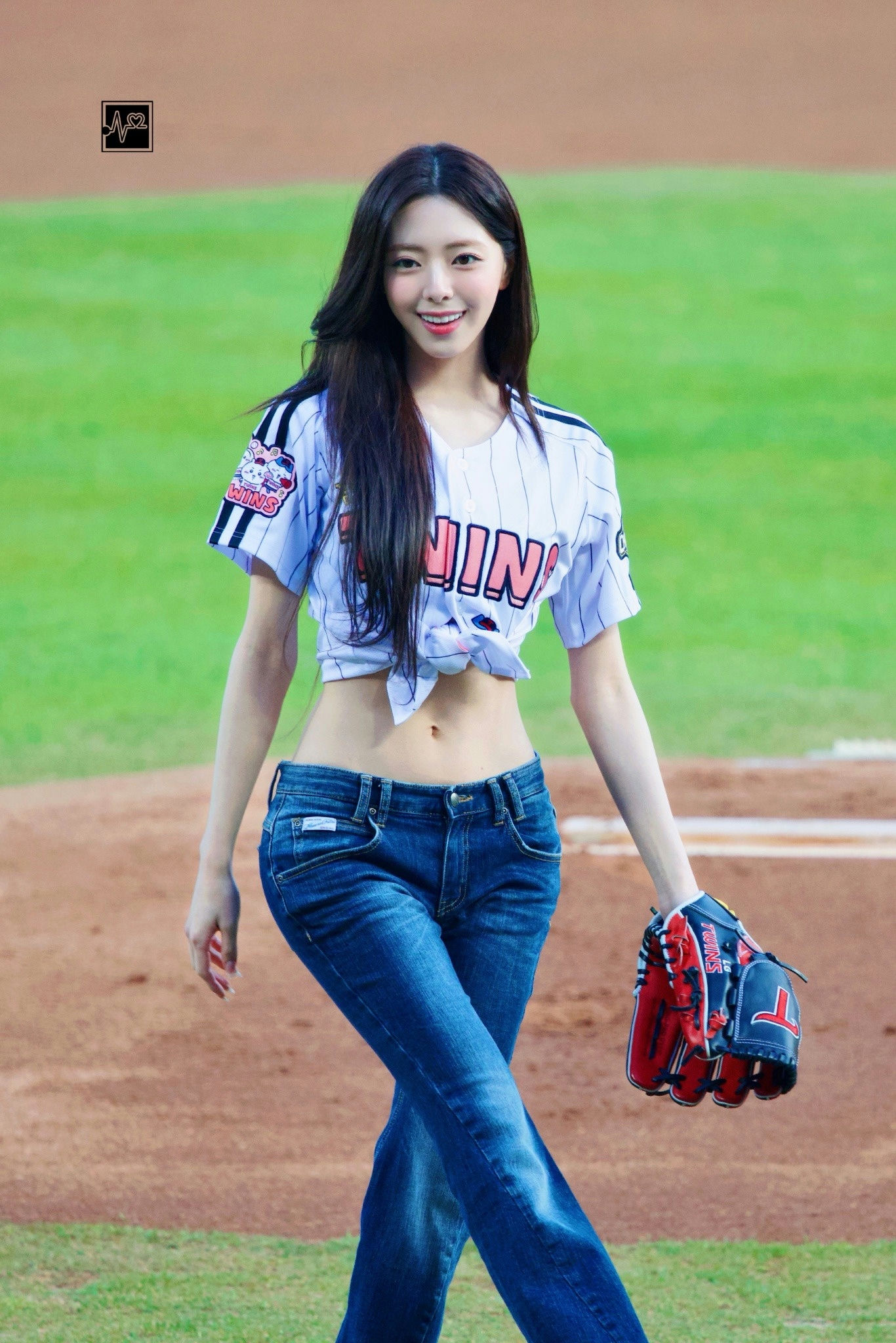 The singer, born in 2003 and a member of ITZY, performed her new track Ice Cream and threw the ceremonial first pitch. Dressed in a cropped baseball jersey paired with fitted jeans, Yuna showcased her toned physique and slim waist, quickly capturing attention both at the stadium and online.