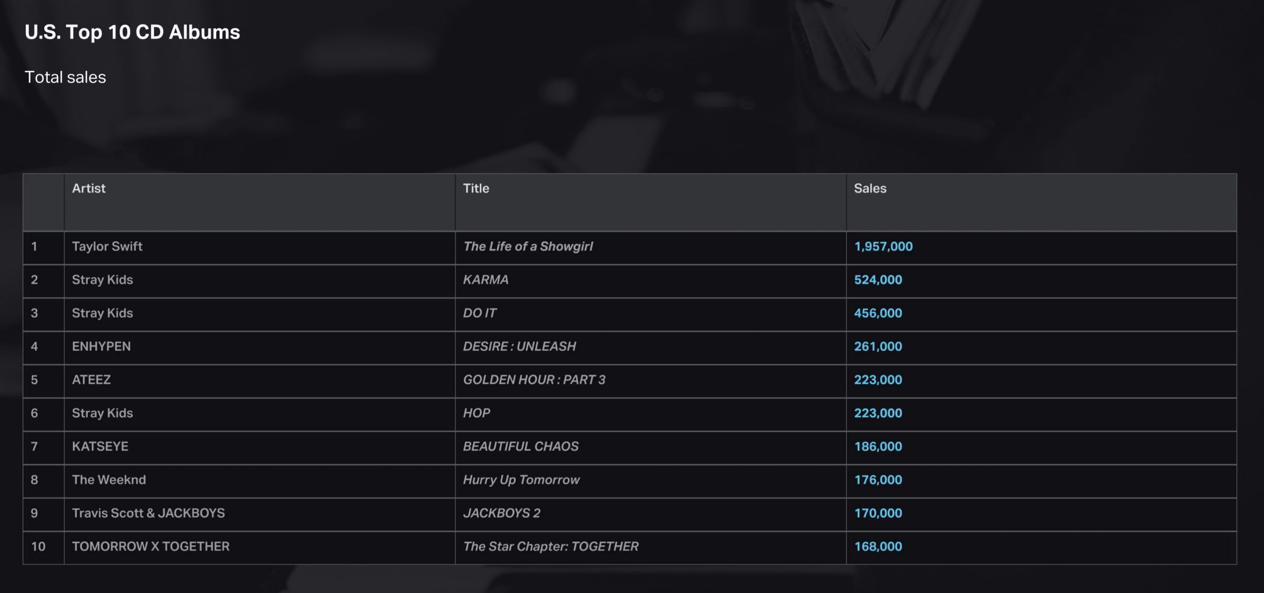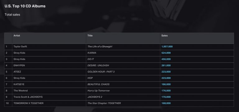On the list ranking CD sales only (not including digital download albums or any other format), Stray Kids swept a whopping three of this year’s top 10 spots. “KARMA” was the No. 2 best-selling CD album of 2025, bested only by Taylor Swift’s “The Life of a Showgirl,” followed by “DO IT” at No. 3. Additionally, Stray Kids’ “合 (HOP)” was the No. 6 best-selling CD of 2025, despite having been released in 2024.
