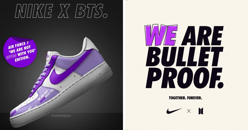 De FILA à McDonald’s, BTS a collaboré avec les plus grandes entreprises du monde. Une marque qu’ils n’ont pas représentée, cependant, est la suivante Nikeune marque américaine de chaussures. Les ARMYs créent maintenant leurs propres produits BTS x Nike dans l’espoir d’une collaboration officielle ! Découvrez leurs créations.