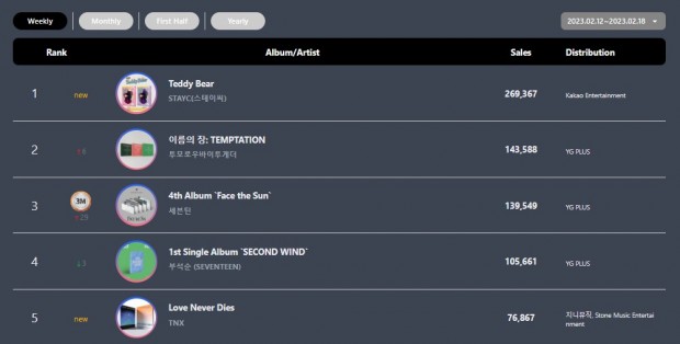 On its No. 1, STAYC claimed the top spot with their newest album “Teddy Bear.” They were followed by TXT’s chart-breaking album “The Name Chapter: TEMPTATION,” which made it to the top five after climbing six spots.