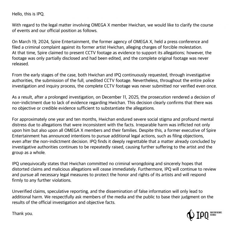 In March of last year, OMEGA X’s former agency SPIRE Entertainment held a press conference and filed a criminal complaint against Hwichan for indecent assault, citing CCTV footage as evidence. In response, IPQ and Hwichan repeatedly requested, through the investigative authorities, the submission and review of the full, original CCTV footage, but they reportedly were not provided with it.