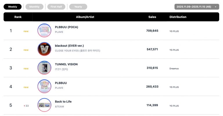 PLAVE swept two of the top four spots on this week’s physical album chart with their new single album “PLBBUU”: the POCA version of the album debuted at No. 1, while the regular version charted separately at No. 4.
