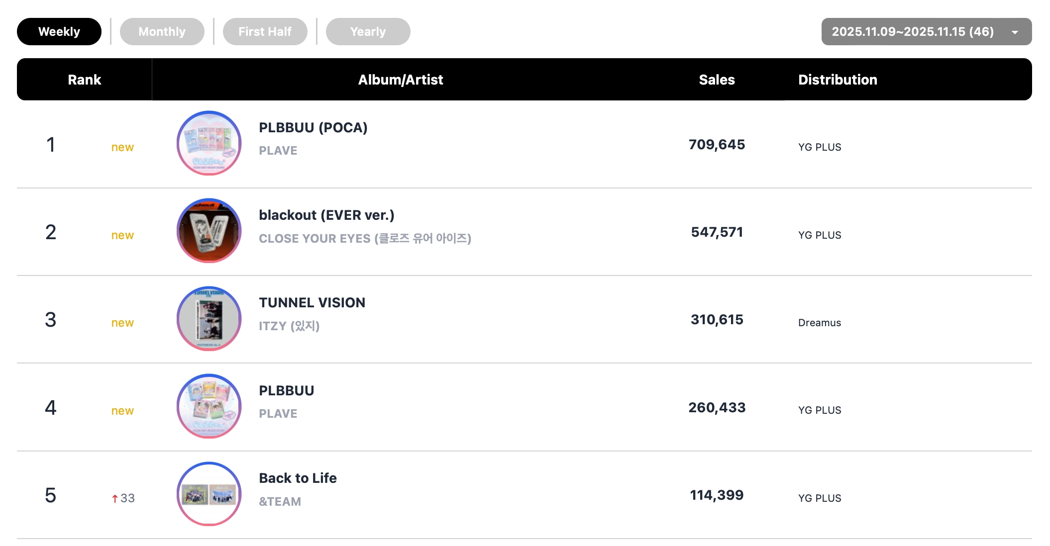 CLOSE YOUR EYES’ new mini album “blackout” entered the chart at No. 2, while ITZY’s new mini album “TUNNEL VISION” debuted at No. 3.