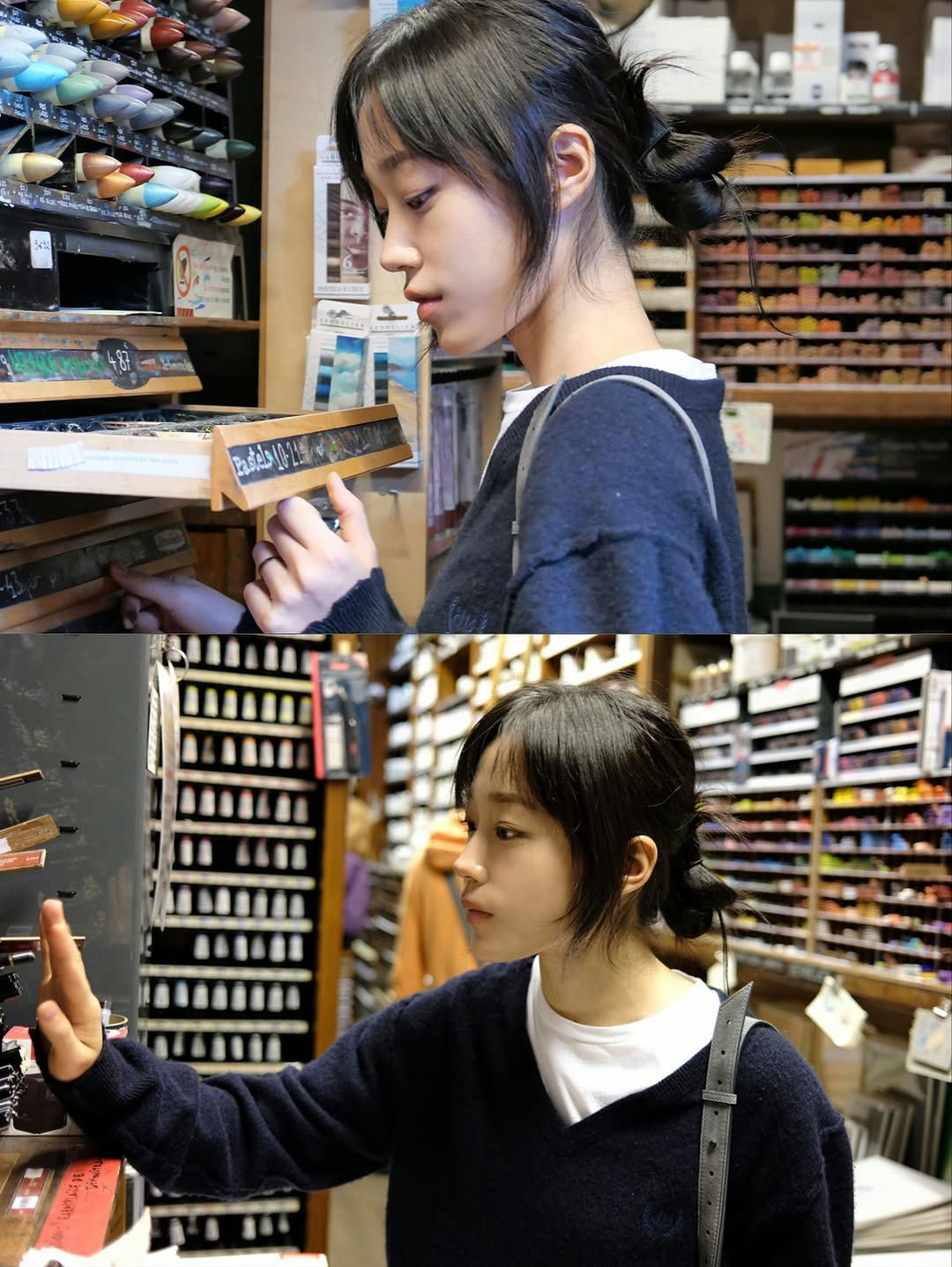 She was seen leaning over a wooden counter, presumably the checkout area, thoughtfully flipping through several books. Despite the simplicity of her outfit and bare-faced makeup, her deep gaze and delicate expression exuded elegance and emotional depth.