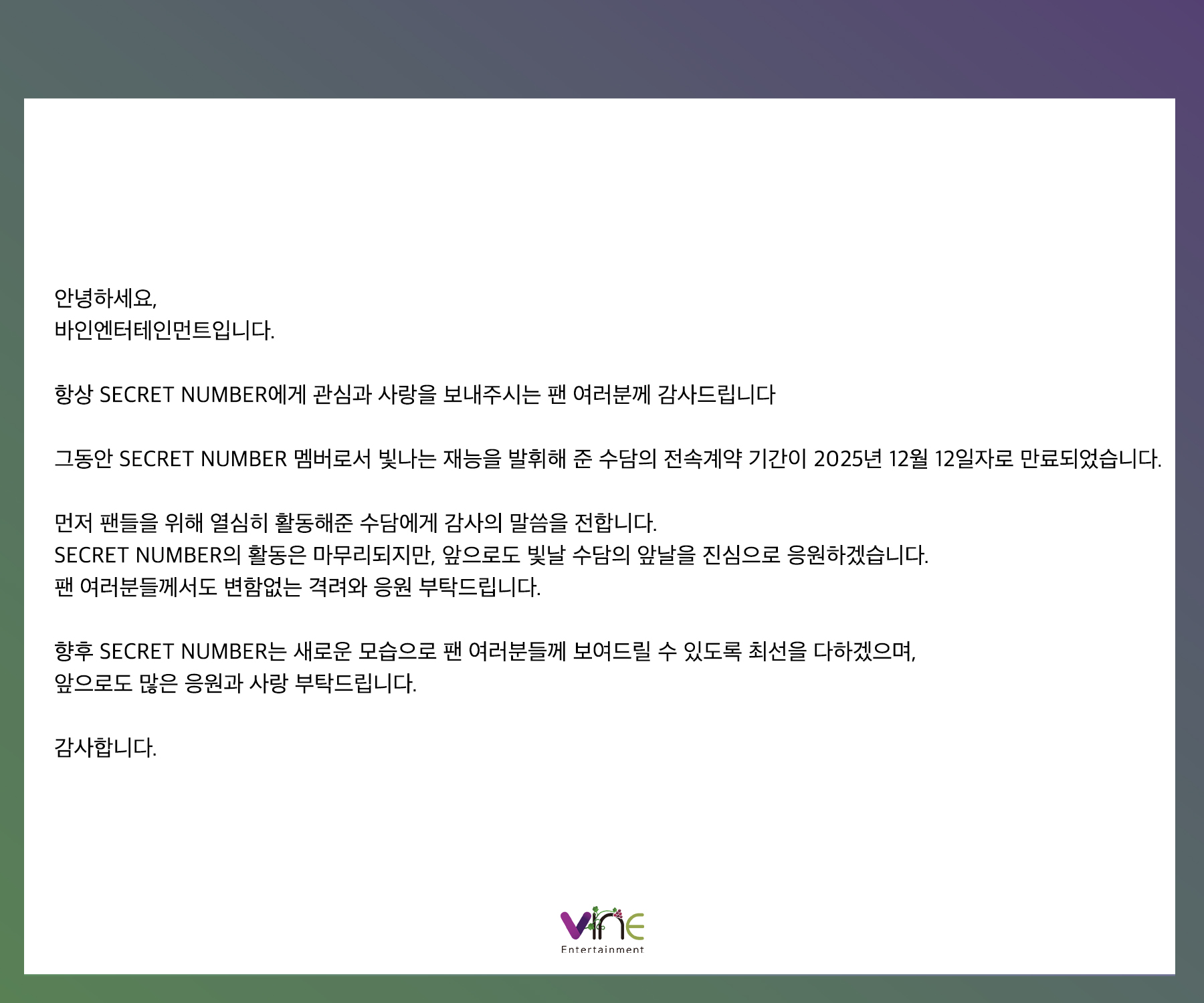 This is Vine Entertainment.We would like to express our sincere gratitude to all the fans who always send their love and support to SECRET NUMBER.