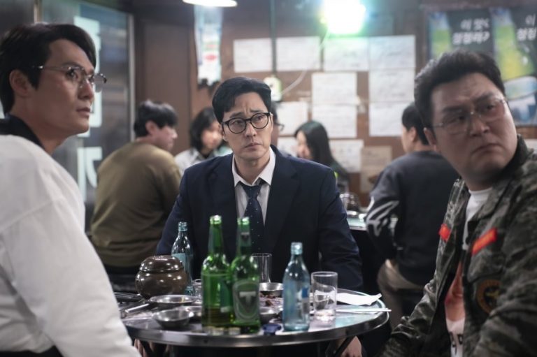 The newly released still shows the three former agents sharing drinks at a modest neighborhood restaurant. Manager Kim appears in a simple suit befitting his life as a bank employee, Sung Han Soo wears his taekwondo uniform, and Park Jin Chul sports a military-patterned casual jacket. Though they now live as ordinary fathers, the trio is captured staring in the same direction with furrowed brows and tense expressions, sparking curiosity about what has caught their attention.