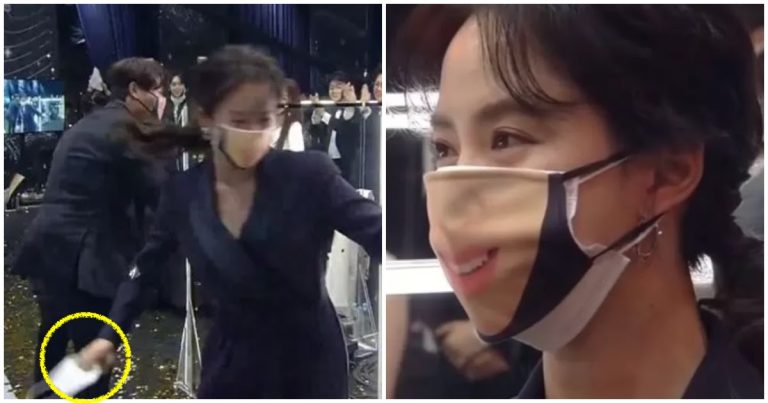 Mais lorsqu’il s’est levé pour recevoir son prix sur scène, le compagnon Homme qui court membre, Chanson Ji Hyo littéralement sauvé ses fesses.