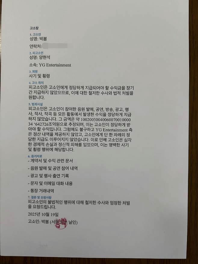 Just a day earlier, Park Bom shocked fans and industry insiders by uploading part of a legal complaint image to her SNS, titled “Defendant Yang Hyun-suk,” accusing him of fraud and embezzlement. She claimed she never received rightful payments for her work across music, broadcasts, performances, and endorsements during her time with 2NE1, stating the amount owed could exceed 6,427 billion KRW. The bizarrely inflated figure and informal tone of the document led many to question the credibility of her claim.